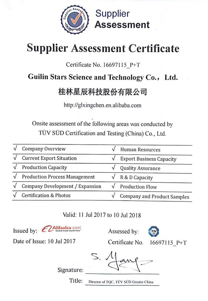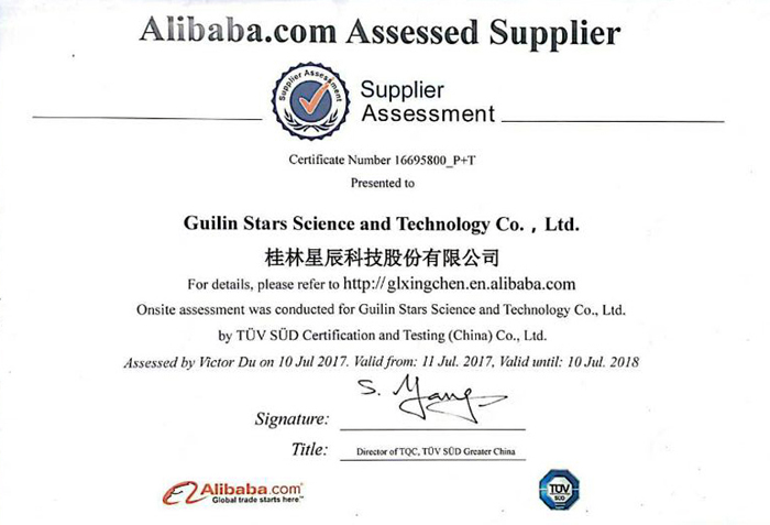 桂林星辰科技股份有限公司于2017年7月11日獲得了德國TüV南德意志集團的權(quán)威認證證書。這標志著星辰科技股份將會在歐洲乃至全球得到生產(chǎn)廠商、供應(yīng)商及各國認證機構(gòu)的廣泛認可;同時,桂林星辰科技股份也得到了阿里巴巴國際站“金品誠企”的榮譽稱號,為星辰科技股份開辟海外市場,拓展國際貿(mào)易業(yè)務(wù),提升產(chǎn)品市場競爭力,獲取更高的國際關(guān)注度提供了強有力地保障。