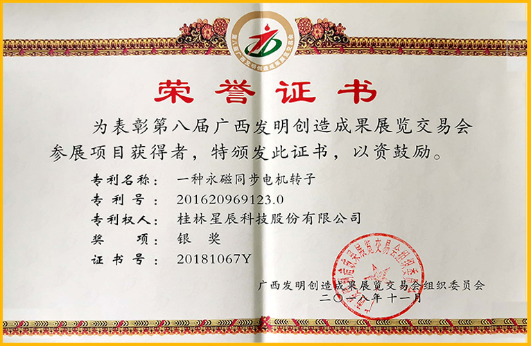 2018年11月,星辰科技專利“一種永磁同步電機(jī)轉(zhuǎn)子”榮獲第八屆廣西發(fā)明創(chuàng)造成果展銀獎。
